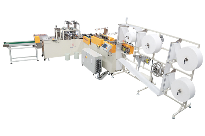 1.全自動四層面料柳葉型口罩成型加工。采取一出二結(jié)構(gòu),由柳葉型口罩打片機 1 臺,雙工位耳帶焊接機 1 臺,分流傳輸裝置一套,上料架一套,電控系統(tǒng)一套組成。結(jié)構(gòu)精巧,操作簡單,性能穩(wěn)定可靠。