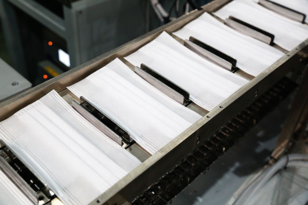 1.面層、濾層(或雙濾層)、底層三卷或四卷面料自動對齊入料,雙邊對稱超聲連續壓邊,經連續滾輪壓邊切斷后,進行耳帶焊接以提高生產 效率,焊完耳帶和包邊切斷后自動計數碼堆。