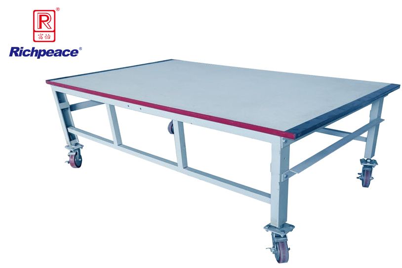 模塊式設計,便于拆裝的同時,運用重型結構設計,抗 沖擊性強,能更好的滿足各種型號的鋪布機的要求。表 面符合1mm厚高耐磨美耐板,同時滿足人工裁剪使用。