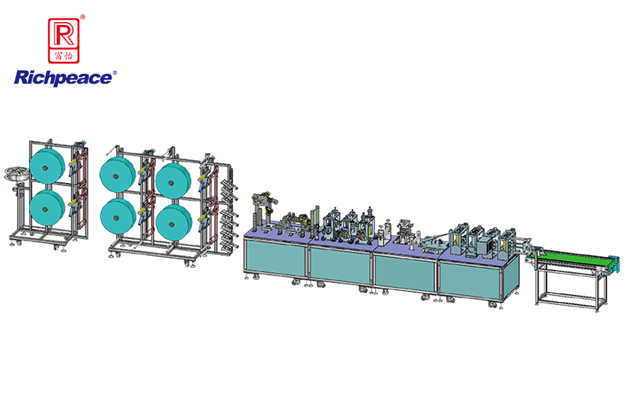 1.口罩一次性焊接成型,面層、濾層、底層3-6卷料自動(dòng)對齊入料,自動(dòng)嵌入鼻梁條,花型自動(dòng)焊接,自動(dòng)分揀成品和廢料,省人工,高效率。