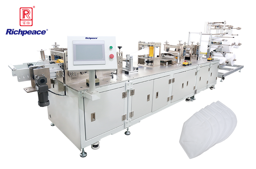 1.1-6 層面料自動對齊入料、鼻梁條剪切推送(選配)、花輥壓花、自動噴?。ㄟx配)、對折入料、封邊、套切到引料導出全流程自動化打片作業。